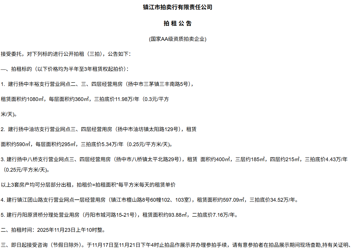 鎮江市拍賣行有限責任公司拍 租 公 吿(國家AA級資質拍賣企業)接受委托,對下列標的進行公開拍租(三拍),公告如下:—、拍租標的(以下價格均為半年至3年租賃權起拍價):1.  建行揚中豐裕支行營業網點二、三、四層經營用房(揚中市三茅鎮三豐南路5號),租賃面積約1080㎡,每層面積約360㎡,三拍底價11.98萬/年(0.3元/平方米/天)。2.  建行揚中油坊支行營業網點三、四層經營用房(揚中市油坊鎮太陽路129號),租賃面積約590㎡,每層面積約295㎡,三拍底價5.34萬/年(0.25元/平方米/天)。3. 建行揚中八橋支行營業網點三、四層經營用房(揚中市八橋鎮太平北路29號),租賃  面積約400㎡,三層約185㎡,四層約215㎡,三拍底價4.43萬/年(0.25元/平方米/天)。以上3套房產均可分層部分出租,拍租價=拍租面積*每平方米每天的租賃單價4. 建行鎮江團山路支行營業網點一層經營用房(鎮江市檀山路8號60幢102、103室),租賃面積約597.09㎡,三拍底價34.52萬/年。5. 建行丹陽原賢橋分理處營業用房(丹陽市城河路15-21號),租賃面積約93.88㎡,二拍底價7.16萬/年。二、拍租時間:2025年11月23日上午10時整。三、即日起接受咨詢(節假日除外)。于11月17日至11月21日下午4時止拍品作展示并辦理參拍手續,請有意參拍者在拍品展示期間現場查勘,持有關證明、簽署相關說明、繳納相應的參拍保證金辦理參拍手續。四、咨詢、拍租地點:鎮江市長江路9號五、聯系方式:0511-85275988   13655299933楊先生六、網址:http://www_zjauction_net.freemiumstock.com;微信公眾號:搜索“鎮江市拍賣行” 拍品清單2025.11.23序號名稱起拍價(元)標的說明1建行揚中豐裕支行營業網點二、三、四層經營用房(揚中市三茅鎮三豐南路5號),租賃面積約1080㎡,每層面積約360㎡三拍底價11.98萬/年(0.3元/平方米/天)1、1-3號房產均可分層部分出租,拍租價=拍租面積*每平方米每天的租賃單價;2、意向競拍人在拍賣前需持營業執照或身份證與委托方說明租賃房產經營業態,確定意向后出具房產承租用途承諾書,經委托方審核后,方可交納保證金參加競拍;3、租賃期限為半年至3年(承租方與出租方協商而定),承租方每半年或一年結付租金,租賃期間的水、電費用及其它相關費用均由承租方承擔;4、承租方不得用于經營和保管危險物品,不得用于開設餐飲、娛樂等可能嚴重影響消防安全、運營安全的經營業態,不得用于經營委托貸款、小額貸款等可能冒用委托方名義,帶來聲譽風險的經營業態。租賃期內,承租方不得破壞墻體結構,自行成就消防、安全等使用條件,不得擅自將租賃房屋轉租、轉讓給他人使用,否則委托方有權收回房屋;5、拍租成交后,承租方將租金交至出租方指定賬戶,傭金交至拍賣方賬戶(拍租傭金為該房屋一個月租金)。承租方憑租賃合同無息退還保證金。2建行揚中油坊支行營業網點三、四層經營用房(揚中市油坊鎮太陽路129號),租賃面積約590㎡,每層面積約295㎡三拍底價5.34萬/年(0.25元/平方米/天)3建行揚中八橋支行營業網點三、四層經營用房(揚中市八橋鎮太平北路29號),租賃面積約490㎡,每層面積約245㎡三拍底價4.43萬/年(0.25元/平方米/天)4建行鎮江團山路支行營業網點一層經營用房(鎮江市檀山路8號60幢102、103室),建筑面積約597.09㎡三拍底價34.52萬/年5建行丹陽原賢橋分理處營業用房(丹陽市城河路15-21號),建筑面積約93.88㎡二拍底價7.16萬/年